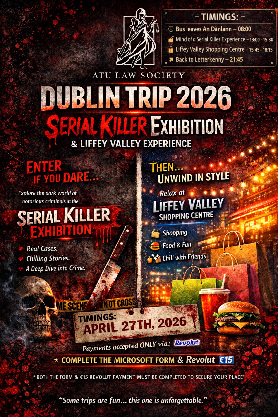 "Hi Everyone, I hope you all are having a lovely Easter break.The ATU Law Society is delighted to announce our final trip of the semester, giving everyone a great opportunity to make lasting memories and enjoy the day as we approach exam season.We will be visiting the Serial Killer Exhibition in Dublin, an immersive experience exploring real-life cases, chilling stories, and the psychology behind some of the world’s most notorious criminals. It is a unique and engaging experience that we highly recommend.Following this, we will head to Liffey Valley Shopping Centre, where you will have time to relax, enjoy food, do some shopping, and spend time with friends.If you are interested in attending and would like to secure a place, you must complete the Microsoft Form ( FORMS LINK ) and pay €15 via Revolut ( LINK ). Please ensure that you include your full name and email address in the payment note.Please note that your place will only be confirmed once both the form and payment have been completed. There are limited seats available, and this trip is open to all students.The deadline for completing both the form and payment is Tuesday, 14 April 2026, as we must finalise ticket numbers in advance. Please also note that this trip, including transport arrangements and any related logistics, is subject to SU approval. We hope to see many of you there. It will be a great opportunity to relax, enjoy the day, and take a break from exam pressure while creating memorable experiences.To contact us: Send us an email, or join the WhatsApp group"